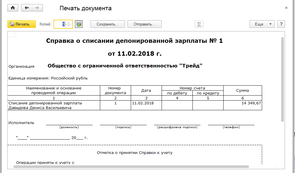 Из формы документа можно вывести на печать справку о списании депонированной зарплаты.