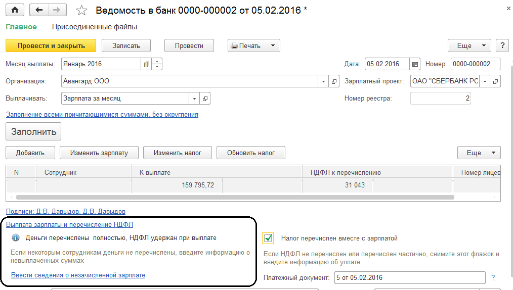 Если зарплата зачислена не полностью, то на основании ведомости на выплату можно ввести документ "Сведения о незачисленной зарплате"