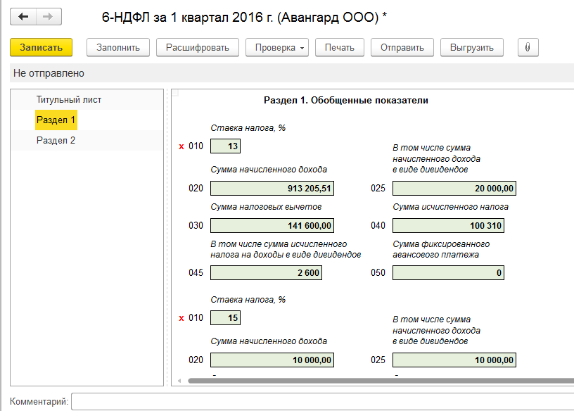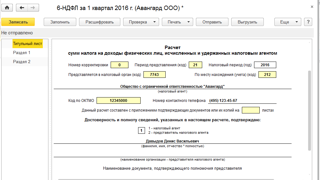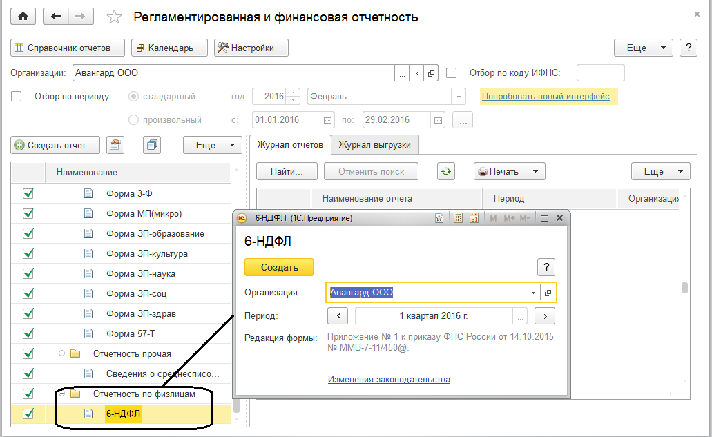 Необходимо сформировать отчет по форме 6-НДФЛ для ООО "Авангард" за первый квартал 2016г.
