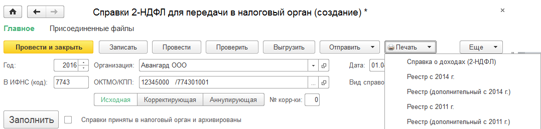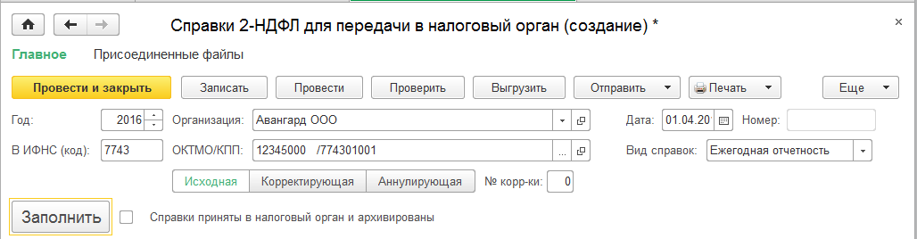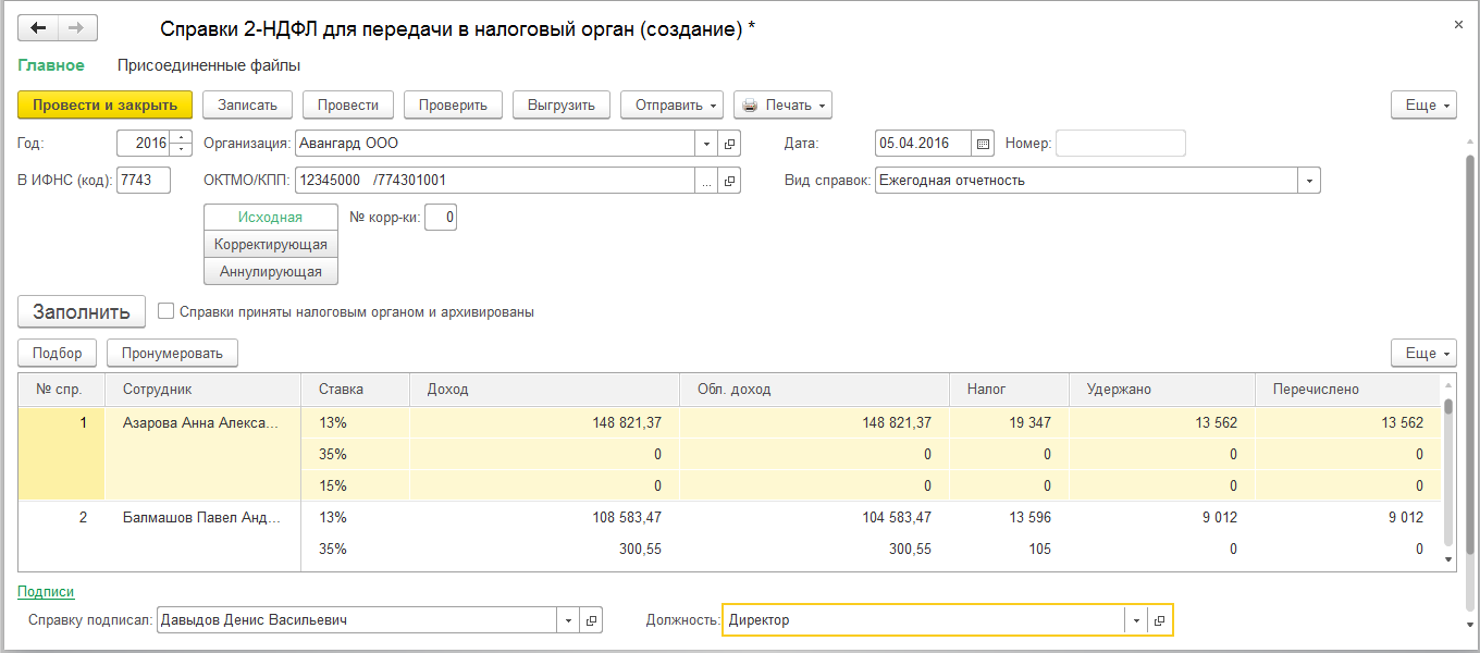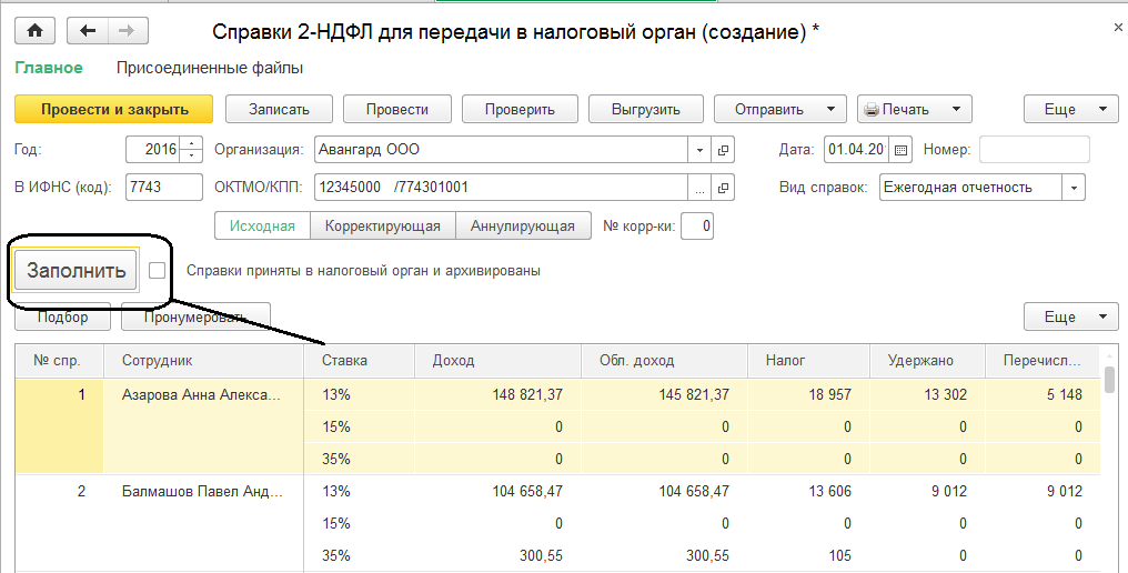 - Создадим и автоматически заполним документ "2-НДФЛ для передачи в ИФНС" для ООО "Авангард" (из раздела "Отчетность, справки/2-НДФЛ для передачи в ИФНС"). Проведем документ
