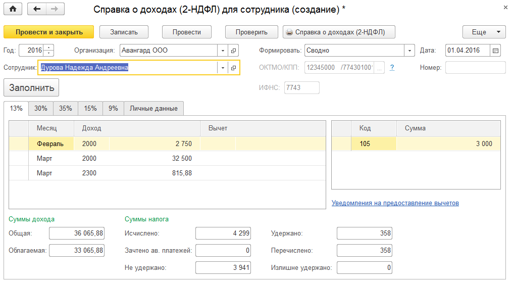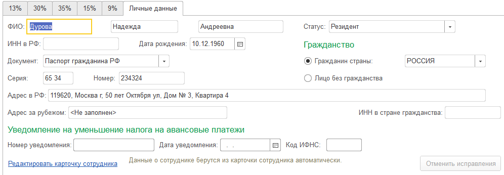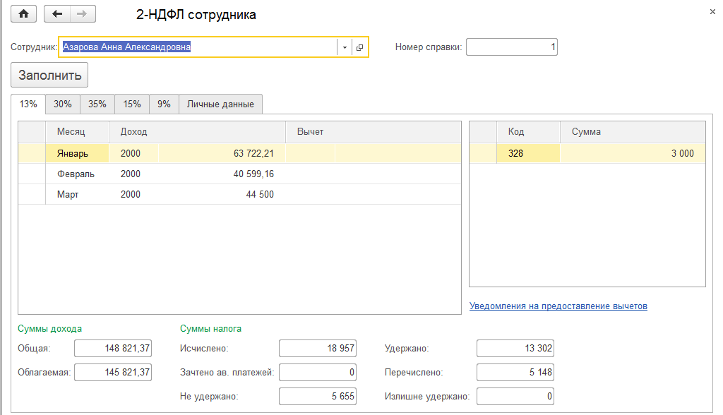 Документ заполняется автоматически при выборе сотрудника. В документе добавлена возможность просмотра сведений о доходах и суммах налога по конкретной справке, а также просмотра и корректировки личных данных физлица.