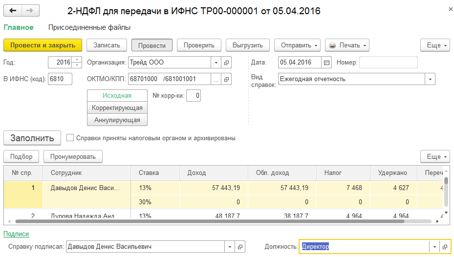 Для формирования данных о доходах для передачи в налоговые органы в конфигурацию включен специальный документ "2-НДФЛ для передачи в ИФНС".