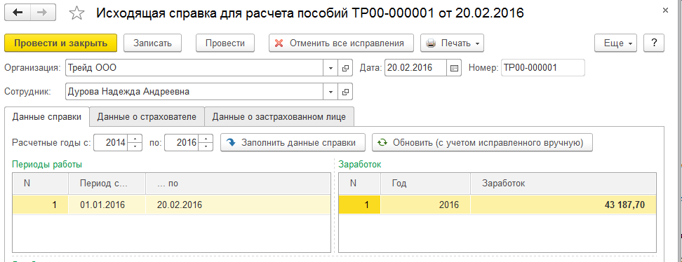 В разделе "Отчетность, справки / Справки для расчета пособий (исх.)" можно сформировать справки сотрудникам, которые они будут предоставлять в другую организацию для назначения пособий по социальному страхованию.