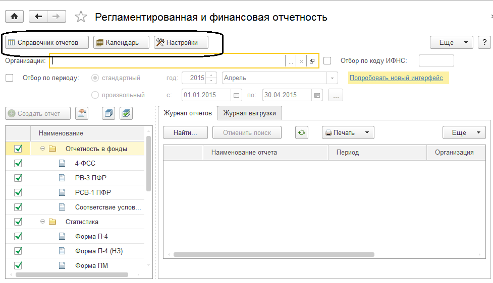 В правой части формы расположены журнал отчетов и журнал выгрузки форм отчетности в электронном виде.