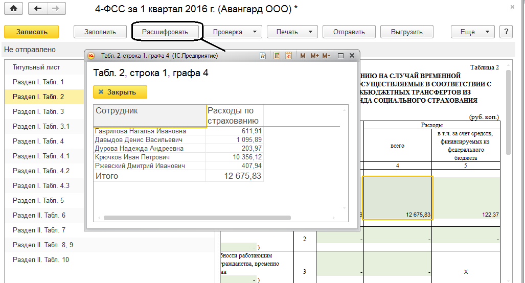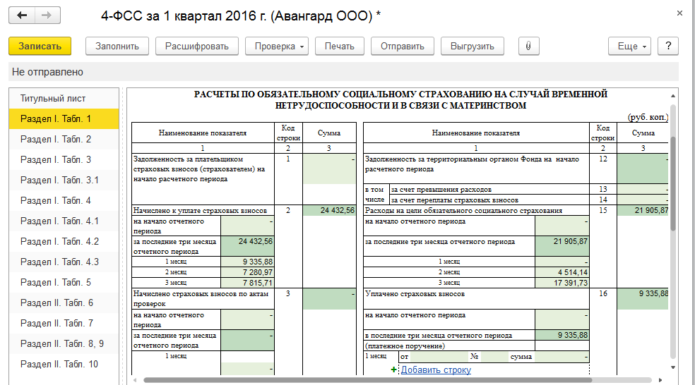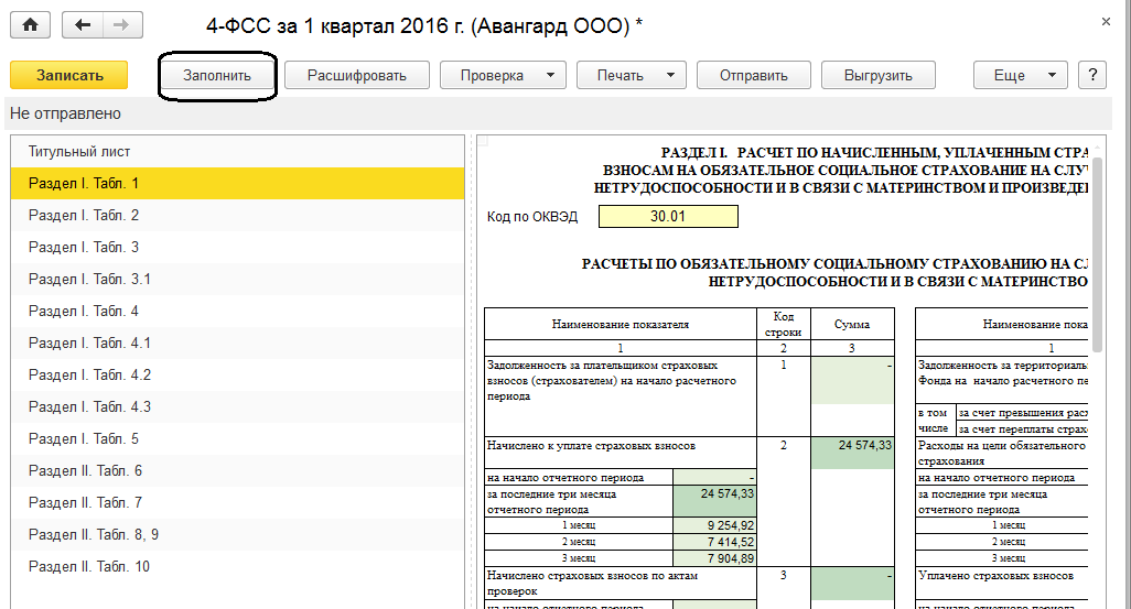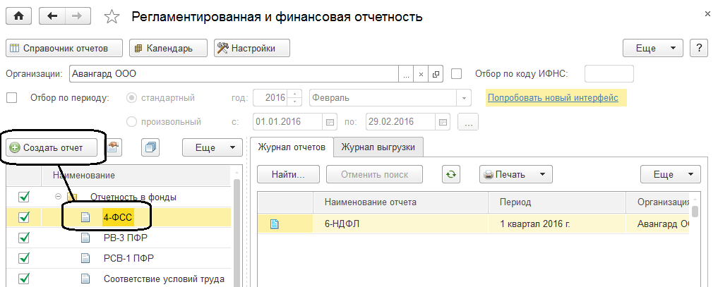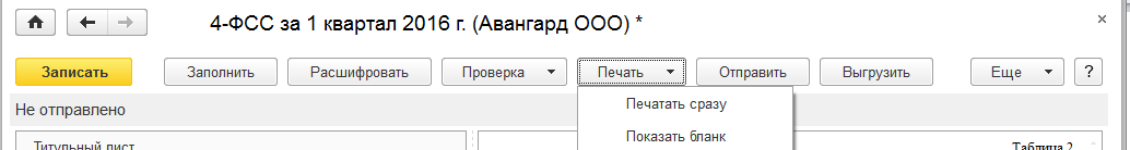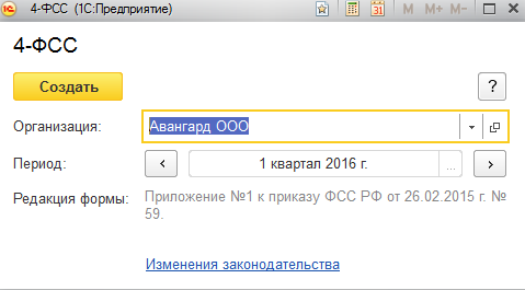 Сформируем формы 4-ФСС для ООО "Авангард" и ООО "Трейд" (форму РСВ-1 создадим вместе с пачками персонифицированной отчетности) за 1 квартал 2016 года. Для этого кликнем на форму два раза левой клавишей мыши, выберем нужный период и нажмем "Открыть". Далее отчет следует заполнить и проанализировать.