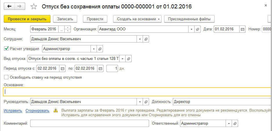 Предоставим отпуск без сохранения оплаты сотруднику ООО "Авангард" Давыдову Д.В. - 02.02.16. Для этого откроем список документов из раздела "Зарплата / Отпуска без сохранения" и создадим новый документ. Заполним документ как на рисунке ниже.