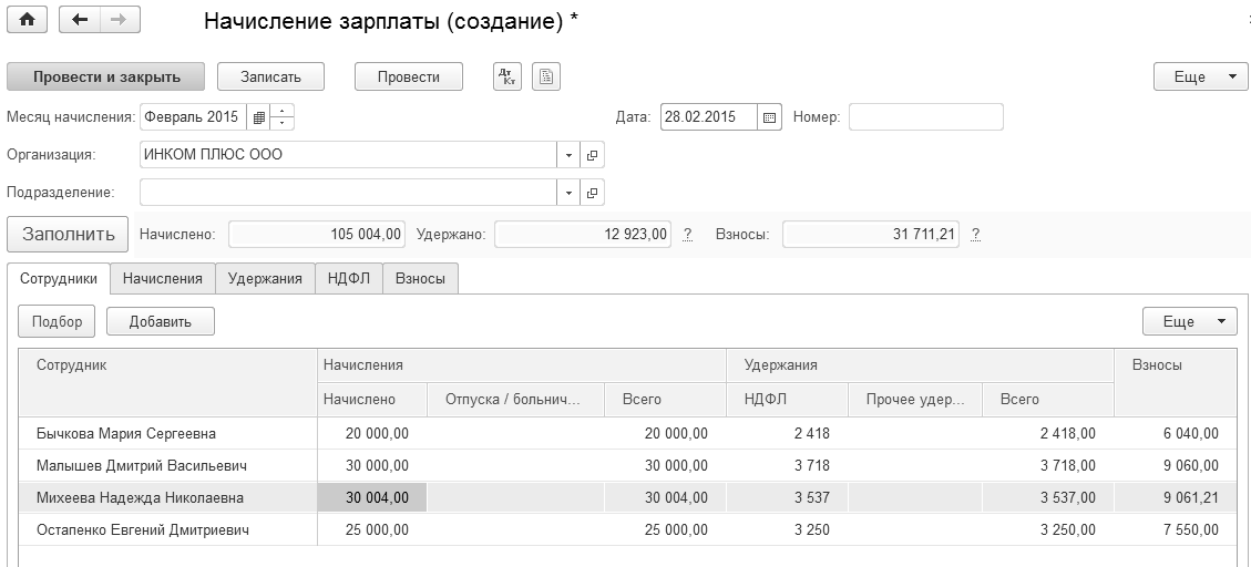 Рассчитайте заработную плату сотрудникам фирмы за февраль 2015 г., исходя из окладов. Все сотрудники отработали месяц полностью, кроме Михеевой Н. Н., которая была в командировке с 18 по 19 февраля 2015 года. Ее средний заработок за февраль составил 30 004 руб.