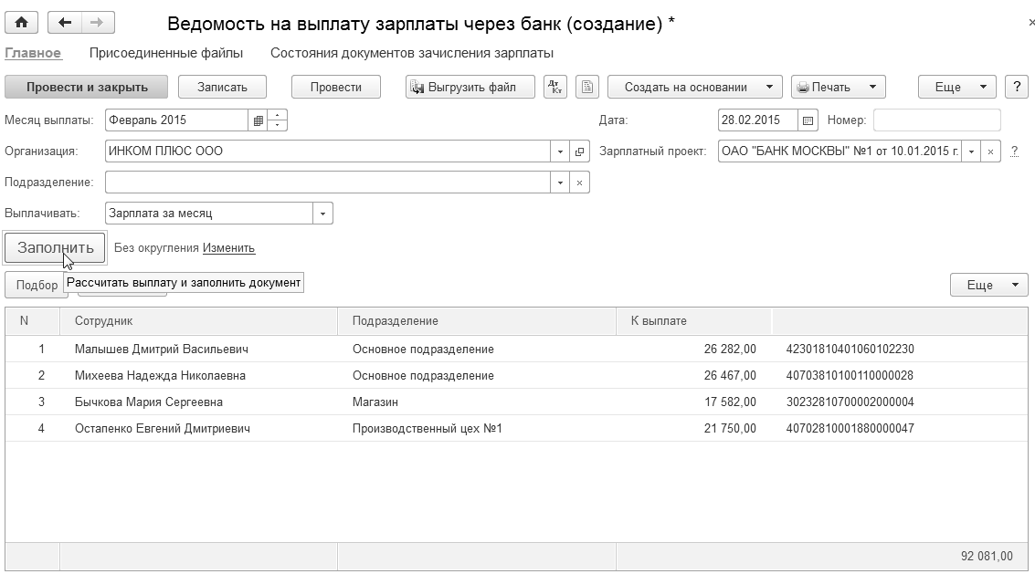 Шаг 6. 28.02.2015 г. перечислите заработную плату в сумме 92 081 руб. контрагенту ОАО "БАНК МОСКВЫ" за февраль платежным поручением (воспользуйтесь механизмом ввода на основании). Суммы перечисляются без НДС. ИНН:7702000406 КПП:774401001