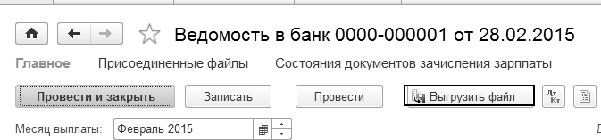 Шаг 2. 28.02.2015 г. создайте документ "Ведомость на выплату зарплаты через банк" (рис. 9.2.2).