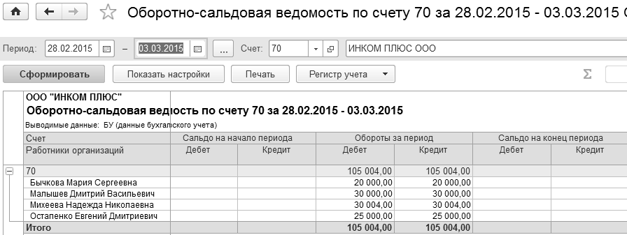 Шаг 7. В отчете "Оборотно-сальдовая ведомость по счету" 70 остатка на 3 марта быть не должно (рис. 9.2.4).