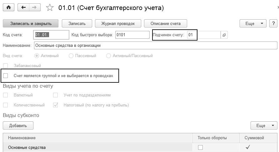 Рис. 2.6. Форма диалога счета 01.01 плана счетов