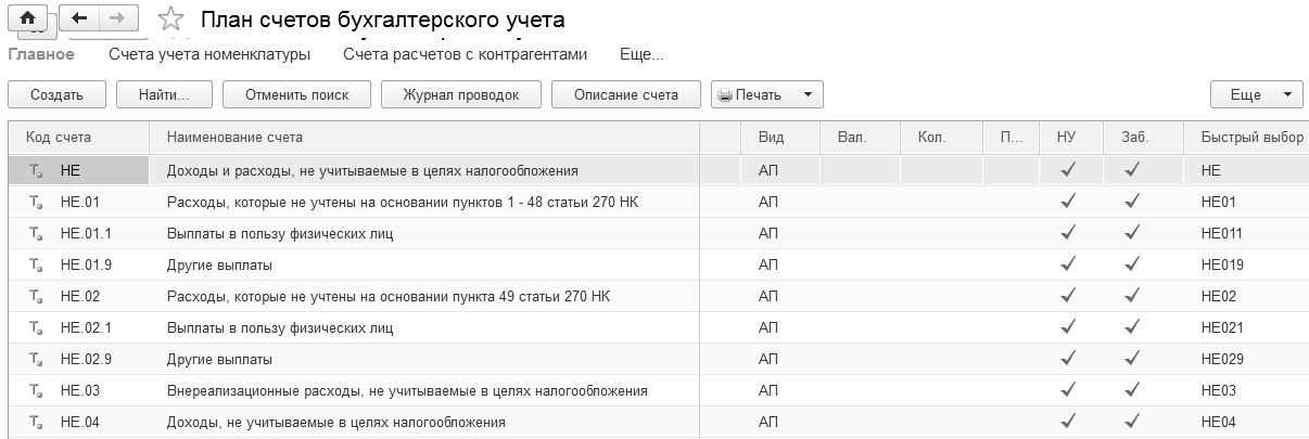 В бухгалтерский план счетов добавлены забалансовые счета "НЕ" (рис. 2.7). Счета "НЕ" предназначены для того, чтобы автоматически учитывать те расходы, которые не должны отражаться в целях налогообложения. Появление таких счетов исходит из требования ст. 270 НК РФ.
