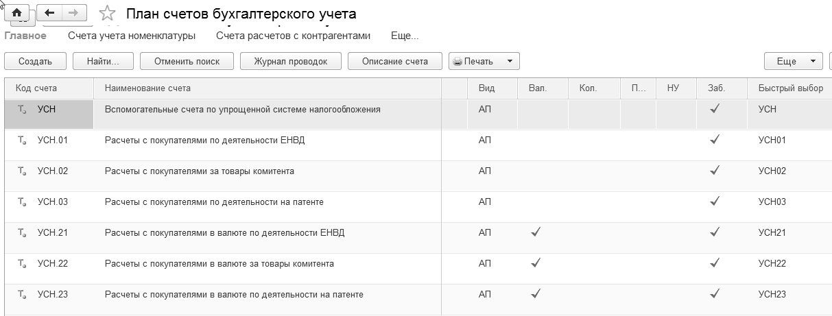 Для отражения в программе операций по упрощенной системе налогообложения в плане счетов открыты забалансовые счета с префиксом "УСН".