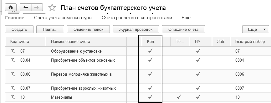 В плане счетов прописан количественный учет. Если в графе "Кол" стоит знак