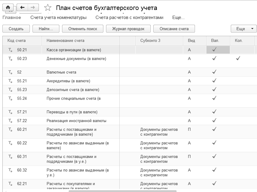 В плане счетов прописан валютный учет. Если в графе "Вал" стоит знак