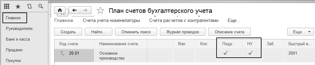 (меню "Панель разделов/Главное/Панель навигации/Настройки/План счетов")