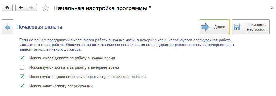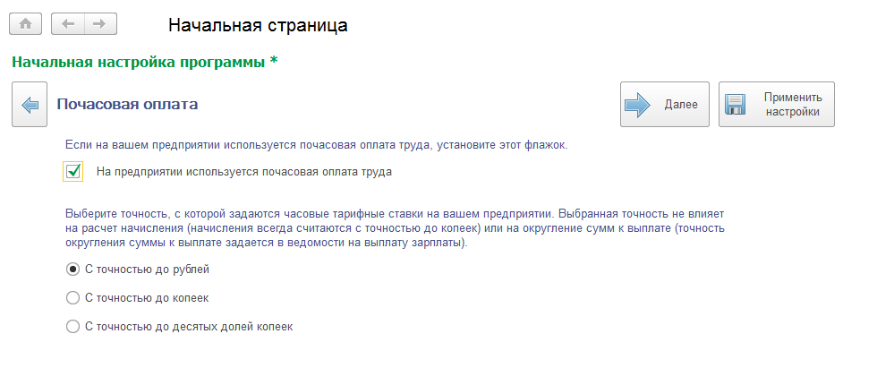 Кроме точности размера оплаты, настройки соответствуют настройке программы в разделе "Расчет зарплаты / Настройка состава начислений и удержаний / Почасовая оплата".