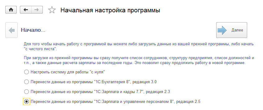 На первом шаге работы помощника начальной настройки существует возможность выполнить перенос данных из программ "Зарплата и кадры 7.7", редакция 2.3, "Зарплата и Управление Персоналом 8", редакция 2.5, либо из конфигурации "Бухгалтерия Предприятия", ред.3.1. Перенос данных непосредственно в приложение возможен только при работе в "тонком клиенте".