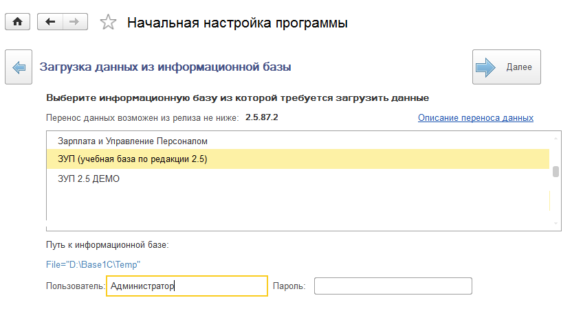 Далее следует указать путь к информационной базе, откуда данные переносятся – здесь следует обратить внимание на релиз конфигурации, ниже которого перенос невозможен, и при необходимости – обновить базу-исходник  до указанного релиза. Поскольку перенос осуществляется в монопольном доступе, все другие сеансы работы в программе должны быть завершены. Переносить данные следует пользователю с полными правами (в обеих программах).