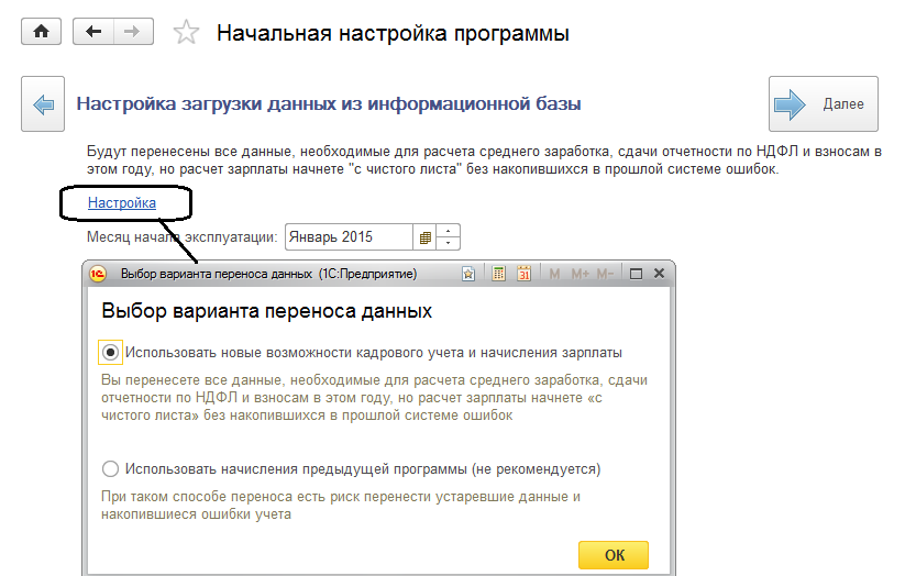 Поэтому в качестве рекомендуемого способа переноса предлагается вариант "Использовать новые возможности кадрового учета и начисления зарплаты". После такого способа переноса необходимо выполнить начальную настройку программы. На текущий момент предусмотрен перенос следующих данных: