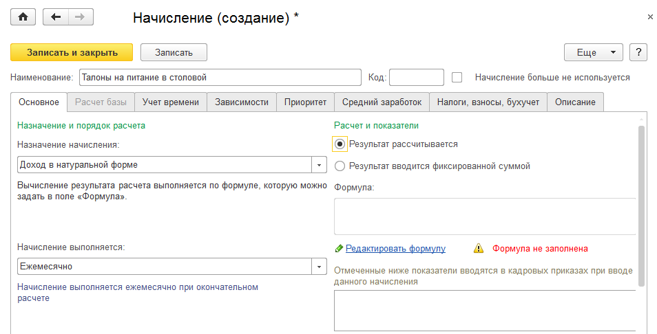 Проверим настройки на других закладках. Так, в рамках учебного примера очистим закладку "Зависимости", проверим настройки среднего заработка и налогообложения и сохраним начисление.