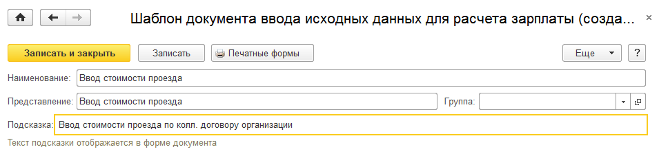 Для ввода размера компенсации стоимости проезда по организации также добавим шаблон документа "Данные для расчета зарплаты":