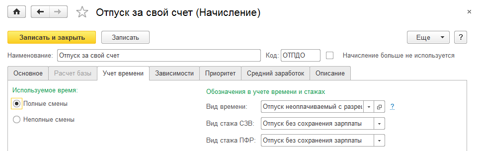 Также для такого отпуска может быть настроен отдельный вид времени и вид использования в отчетности ПФР по стажу.