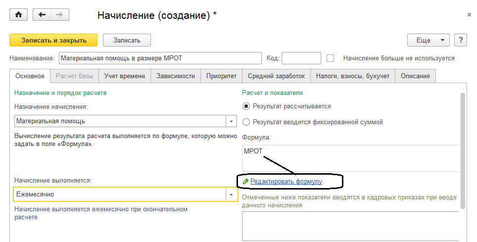 Начисления с такими настройками могут быть добавлены при установке флажка "Выплачивается материальная помощь" в настройках расчета зарплаты. По умолчанию начисления вводятся суммой, однако пользователь может составить для такого вида расчета собственную формулу.