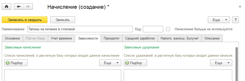 Отредактируем закладку "Зависимости" - считаем, что начисление не будет входить в базу данных никаких начислений и удержания.