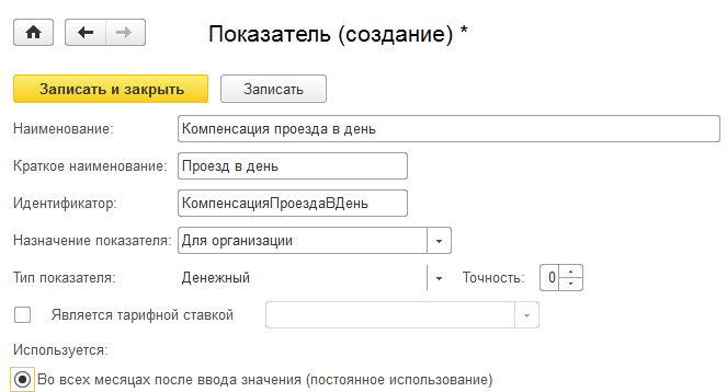 Зададим формулу для этого начисления. Нам потребуется создать новый показатель – компенсация проезда в день. Показатель может быть настроен двумя способами: