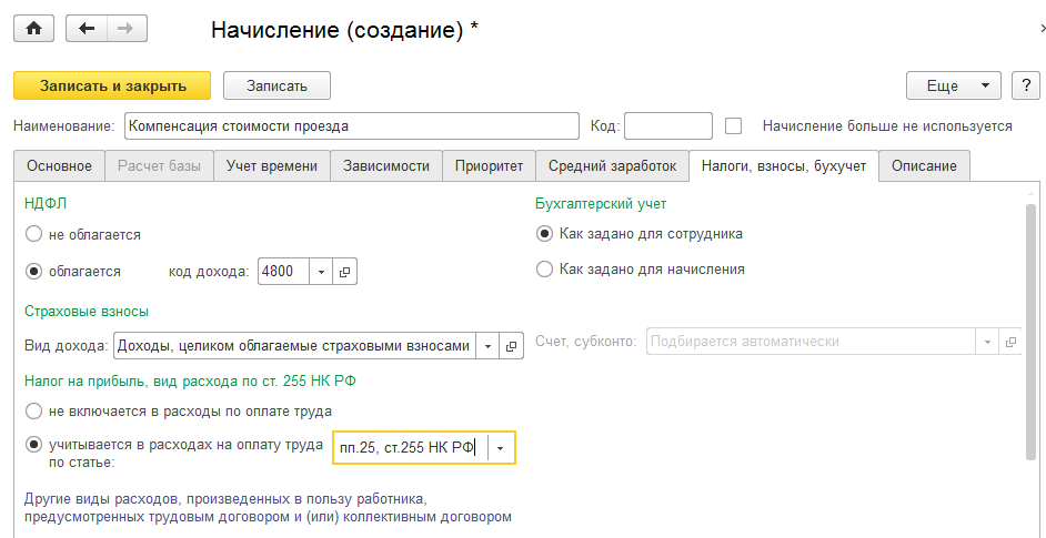 Начисления с этим назначением всегда облагаются страховыми взносами в фонды, а настройка налогообложения по умолчанию устанавливается: код НДФЛ 2000 (также доступны 2760 и 4800) и п.1 ст.255 для учета налога на прибыль (другие пункты также доступны).