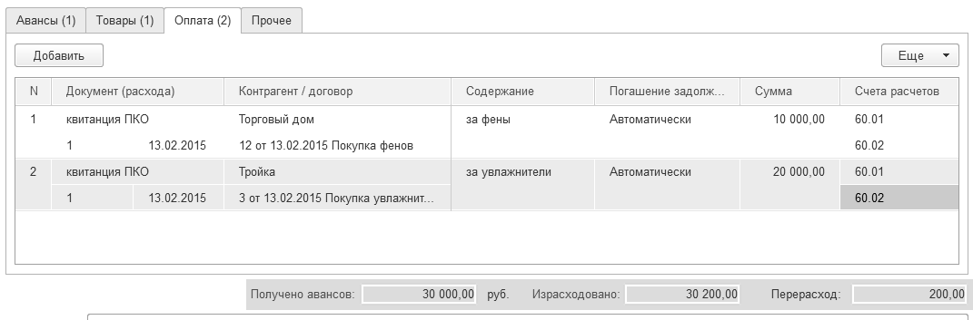 В свойствах документа значение реквизита "Погашение задолженности" имеет значение "Автоматически". Это означает, что программа "пробежала" по всем документам, не нашла операций с договорами "Покупка фенов" и "Покупка увлажнителей", и квалифицировала оплату поставщикам как аванс.