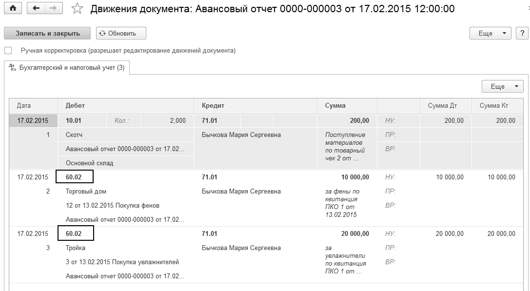 Рис. 7.1.7. Движения документа "Авансовый отчет"