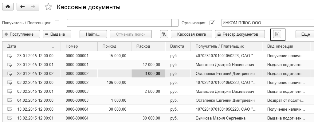13.02.2015 г. из банка в кассу "ИНКОМ ПЛЮС" получены денежные средства в сумме 30 000 рублей. В этот же день сумма 30 000 руб. выдана из кассы Бычковой М. С. на покупку ТМЦ.