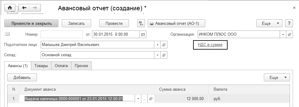 Для целей упражнения в шапке формы документа "Авансовый отчет" должен быть установлен "НДС в сумме".