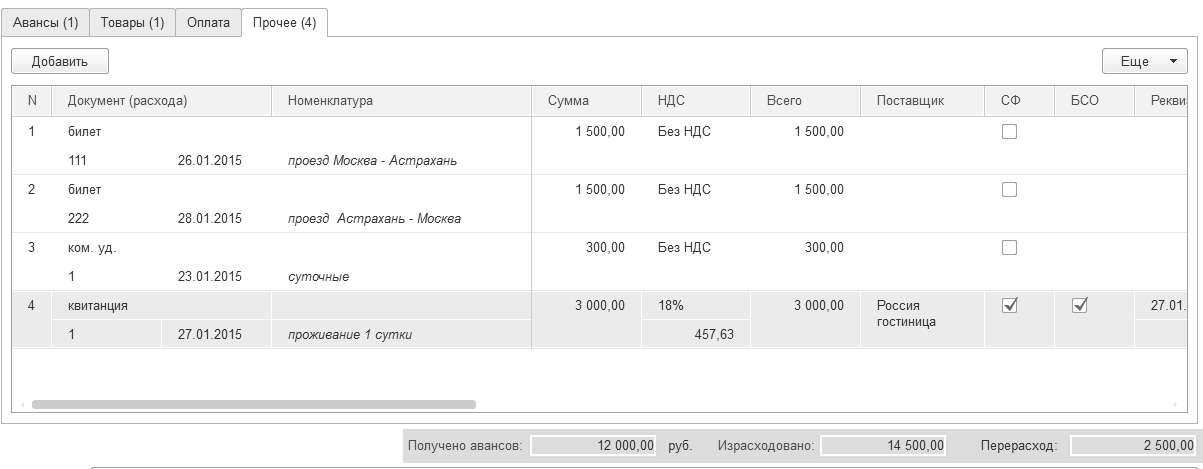 Подотчетное лицо может отчитываться бланками строгой отчетности. Это могут быть расходы по найму жилых помещений, проезд к месту служебной командировки. В этом случае, сумма НДС должна быть выделена отдельной строкой. Эту операцию можно отразить в программе на закладке "Прочее" документа "Авансовый отчет" при помощи установки флага "Бланки строгой отчетности".