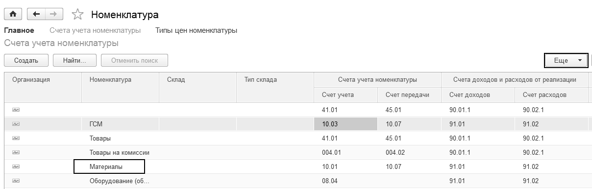 В справочнике "Номенклатура" создайте папку "ГСМ". Для данной папки следует скопировать все те счета, которые назначены папке "Материалы". Для этого откройте справочник "Счета учета номенклатуры", скопируйте папку материалы (F4), выберите вместо нее папку "ГСМ", и замените счет 10.01 на счет 10.03. Сравните выполнение задания с рисунком 7.1.5.