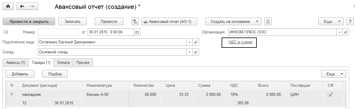 30.01.2015 г. принят авансовый отчет от Остапенко Е.Д. о покупке 60 литров бензина А-92 на сумму 2 000 руб., НДС 18% в том числе (корр. счет 10.03). ООО "ЦИН" представил накладную № 12 и счет-фактуру № 12 от 30.01.2015 г.