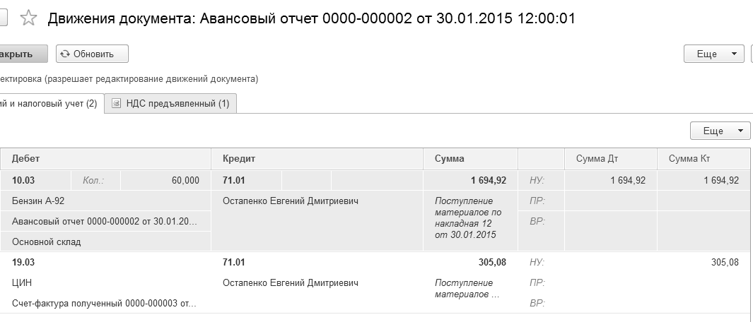 В момент проведения авансового отчета в базе зарегистрировался документ "Счет-фактура полученный" от поставщика ООО "ЦИН". Данный документ оформил проводку по принятию НДС к вычету в сумме 305,08 руб. и регистр накопления "НДС предъявленный" с видом движения "– Расход".