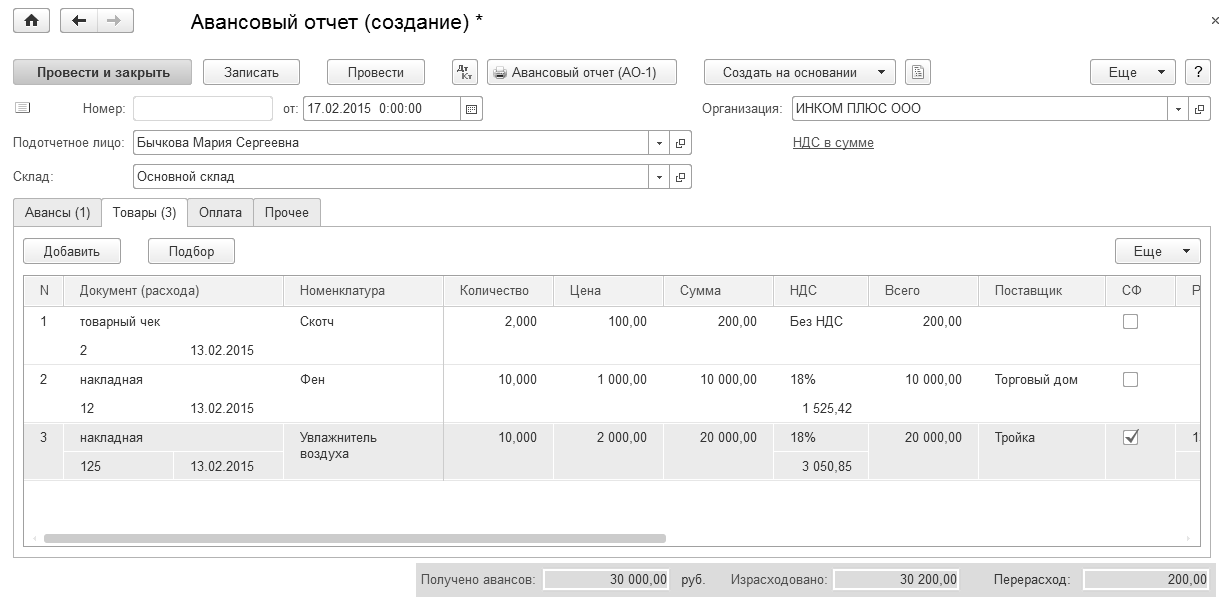 1. Сформируйте документ "Авансовый отчет" датой 17.02.2015 года. Цена операций включает НДС.
