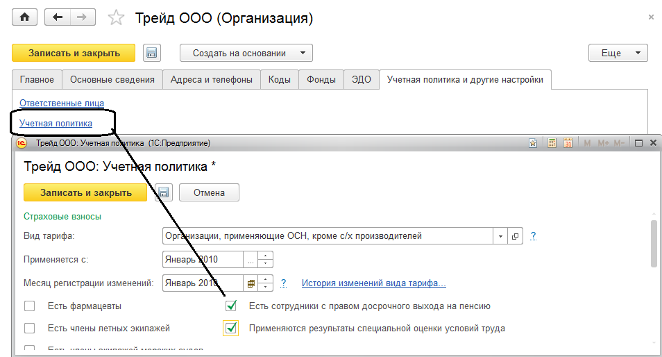 - В организации может быть предусмотрена работа во вредных/тяжелых условиях. В учетной политике организации в таком случае следует указать соответствующие настройки.