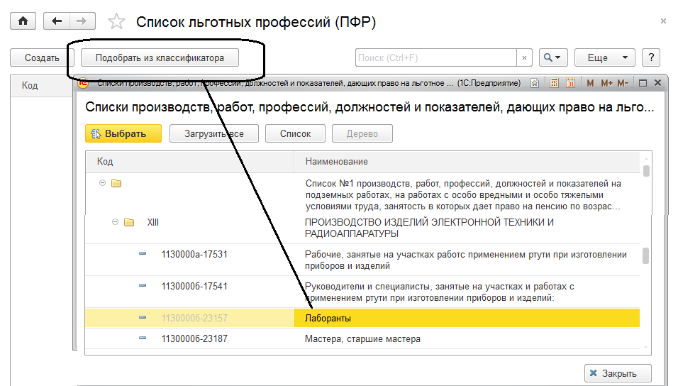Во втором случае следует заполнить справочник "Список льготных профессий (ПФР)". Справочник доступен в разделе "Отчетность, справки". Он заполняется подбором из списков-классификаторов (по аналогии с кадровыми классификаторами).