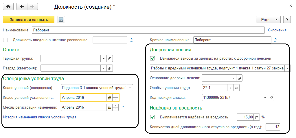 - Если в организации применяется спецоценка условий труда, то уточнить класс условий также можно не только для должности, но и для позиции штатного расписания.