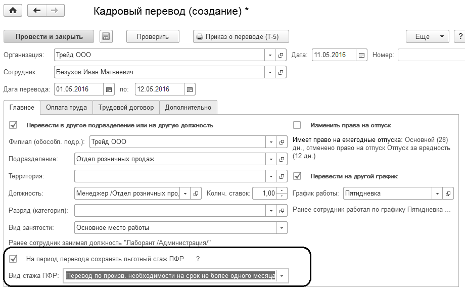 - При работе во вредных условиях могут рассчитываться страховые взносы по дополнительному тарифу (в зависимости от класса условий, если применяется спецоценка). Кроме того, работа в таких условиях отражается в стаже ПФР по указанным в должности кодам. При временном кадровом переводе можно сохранить за сотрудником право на льготы во вредных условиях.
