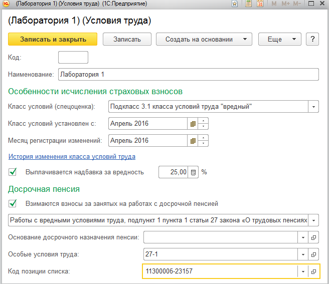 - В справочнике "Должности" те должности, которые предполагают работу во вредных условиях, создаются отдельно. Для каждой должности указываются соответствующие коды для стажа ПФР.
