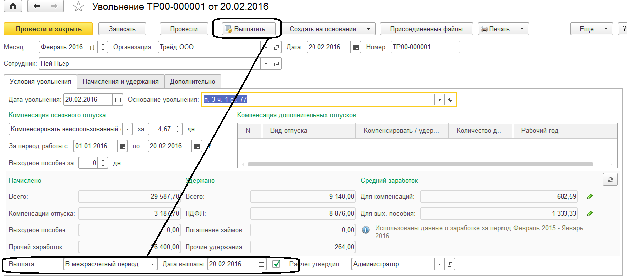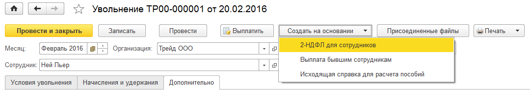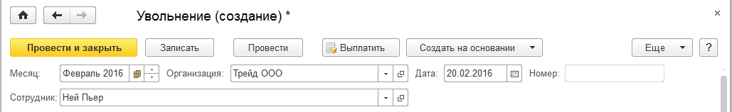 Уволим из ООО "Трейд" сотрудника П.Нея. 20.02.2016 и рассчитаем все причитающиеся ему суммы. Для этого перейдем в разделе "Зарплата / Все начисления" к списку документом и добавим документ "Увольнение". Дата документа и дата увольнения – 20.02.2016, месяц – февраль 2016г. суммы будут рассчитаны автоматически.
