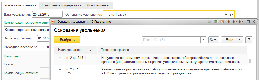 На закладке "Условия увольнения" указывается: