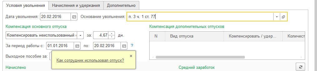 В соответствии с датой увольнения сотруднику автоматически рассчитывается компенсация (либо удержание) отпуска за его рабочий период. При необходимости можно также ввести компенсации дополнительных отпусков (каждого вида отдельно). По ссылке "Как сотрудник использовал свой отпуск" можно просмотреть справку по отпуску.