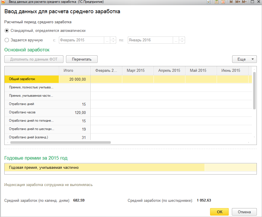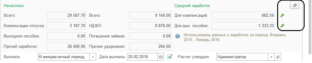 По ссылке "Изменить" можно просмотреть средний заработок – если сведения о зарплате сотрудника были перенесены ранее из другой программы либо рассчитаны в полном объеме, расчет среднего получается полный и недоступен для корректировки.