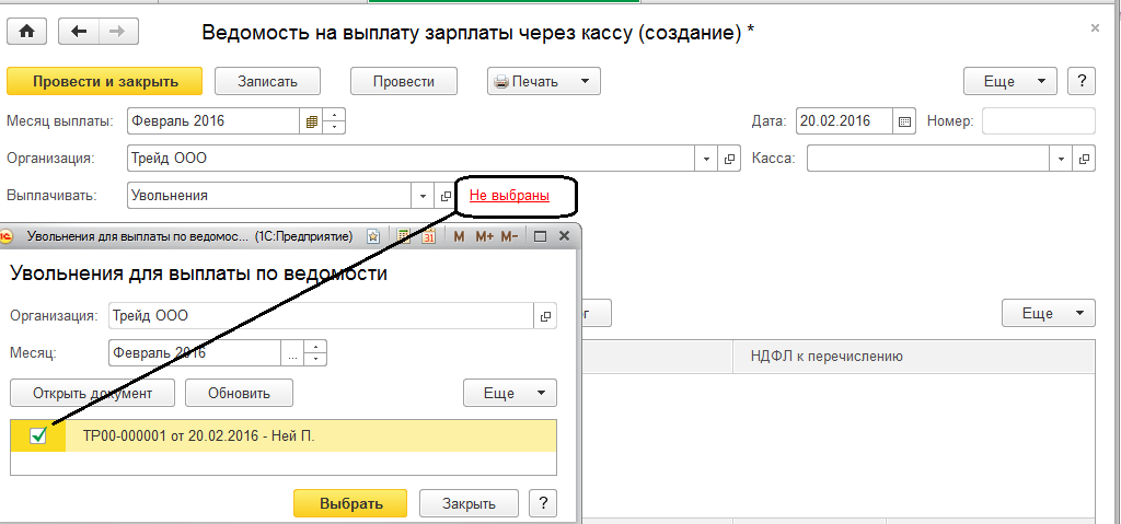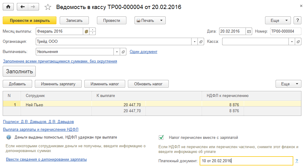 Уточним реквизиты уплаты НДФЛ: № 10 от 20.02.2016 и проведем ведомость в кассу.